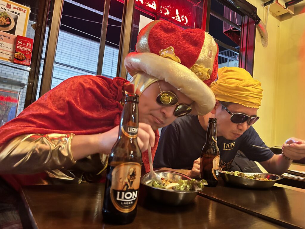 ハロウィンカリーも到着し、腹ペコの2人はカレーとビールが進む進む…!