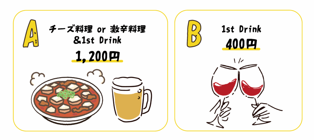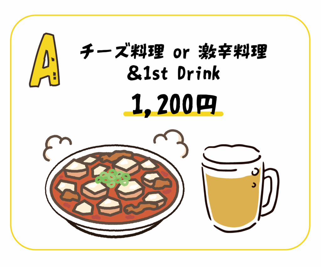 A:熱々な!チーズ料理 or 激辛料理 & 1st Drink 1,200円