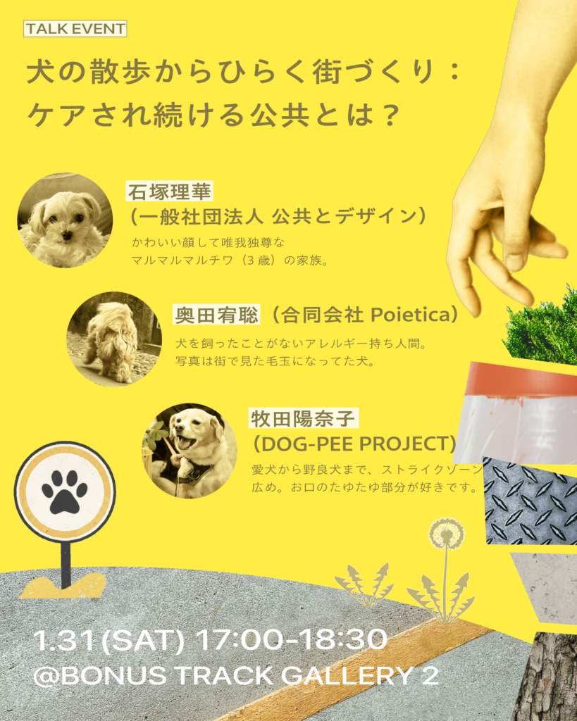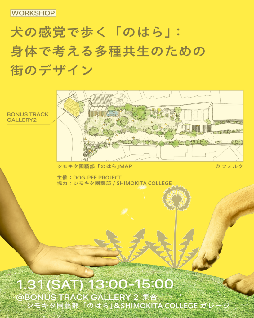人と犬、そして街に生きるさまざまな存在たちとのあいだにひらかれる、人間のためだけではない街の “心地よさ” や”公共性” のあらたなカタチを想像してみます。犬の散歩から広がる「あしもと30センチ」の目線で、街を捉えなおす試みに、ぜひお越しください。