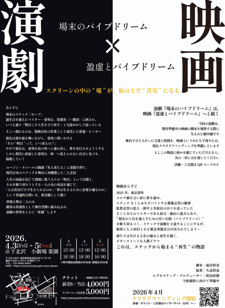 また本作は“劇中劇”として、のちに長編映画『盈虚(えいきょ)とパイプドリーム』へ展開予定(制作準備中)で、公演に合わせて映画制作資金調達のクラウドファンディングも4/1開始に向け準備中です。