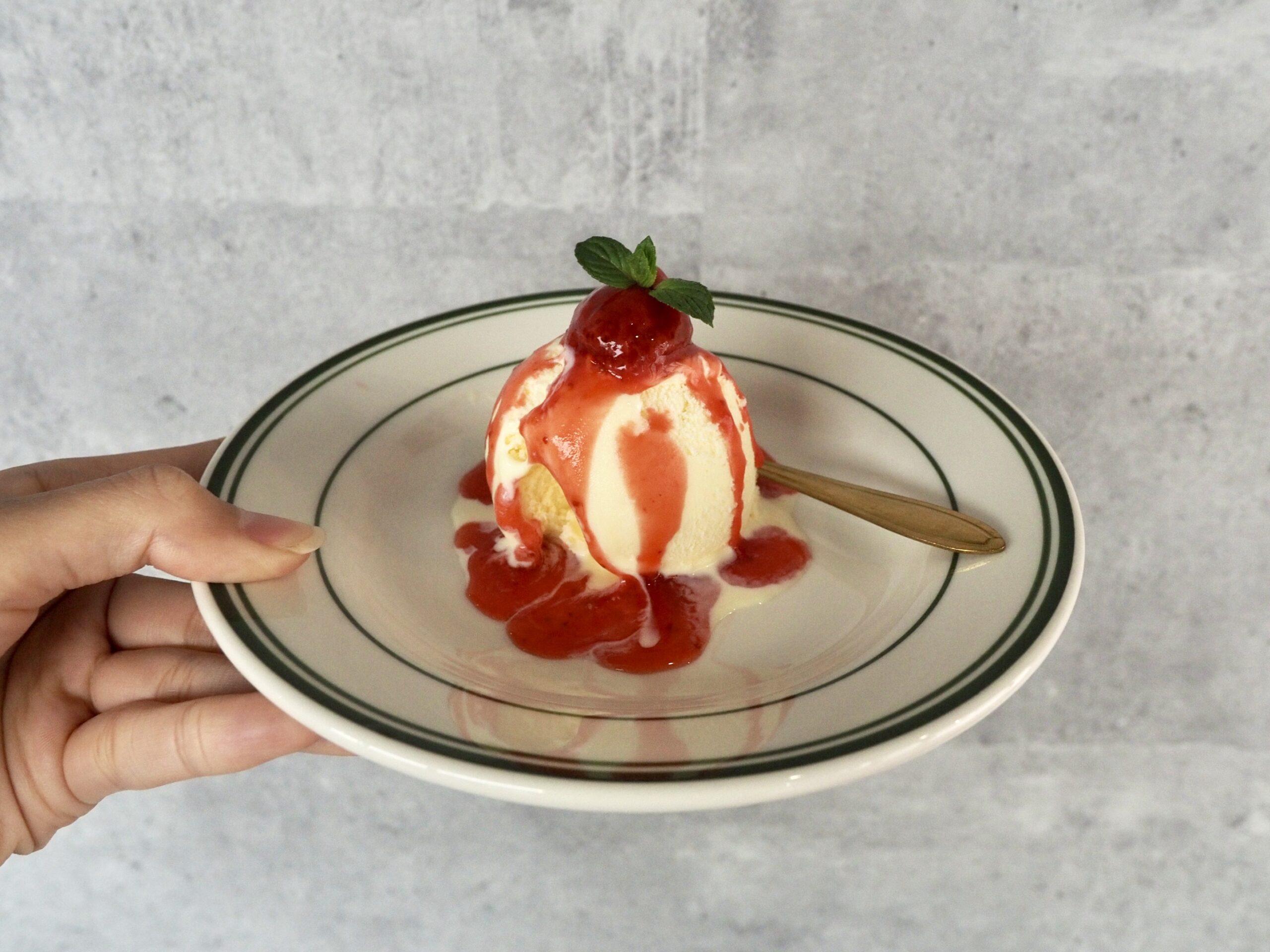 締めのデザート、本日はアイスのストロベリーソース掛け。