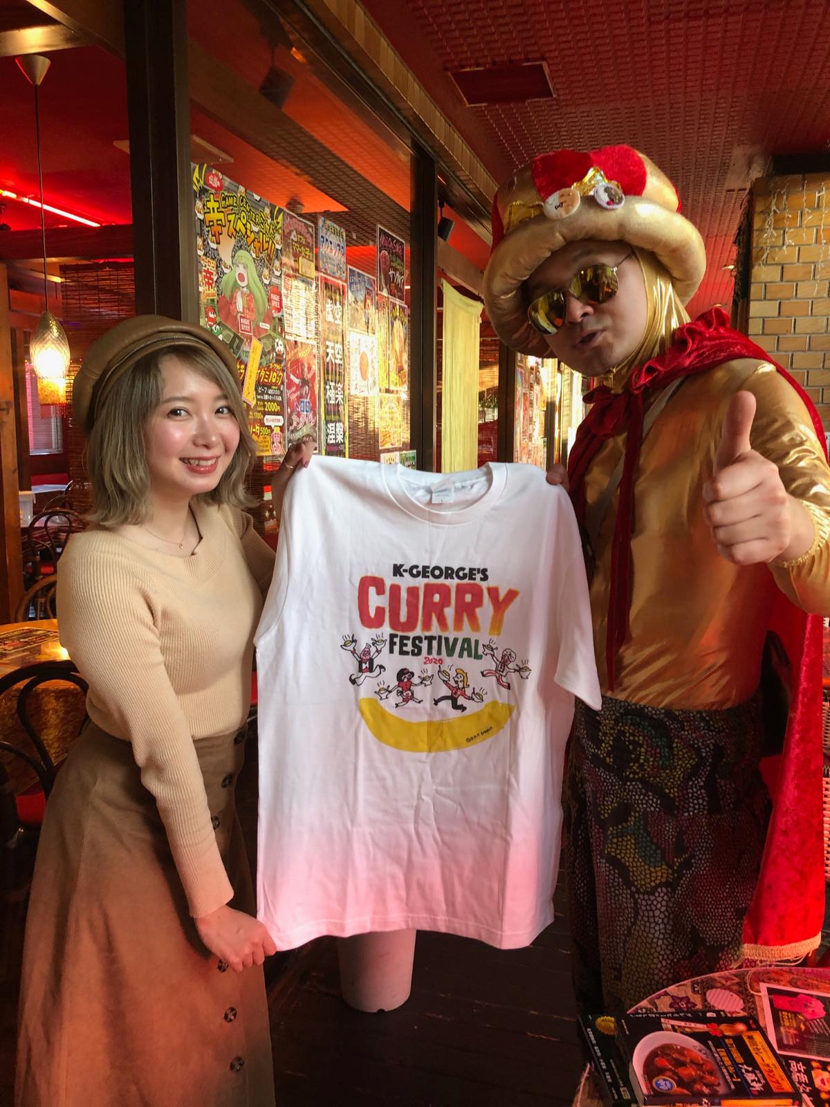 食後は恒例の記念品贈呈!すでにカレーフェスで限定TシャツをGetしていたので、今回は下北沢カレーフェスティバル実行委員会が手がけている吉祥寺カレーフェスティバル2020の限定Tシャツとカレーイヤリングをプレゼントしました。