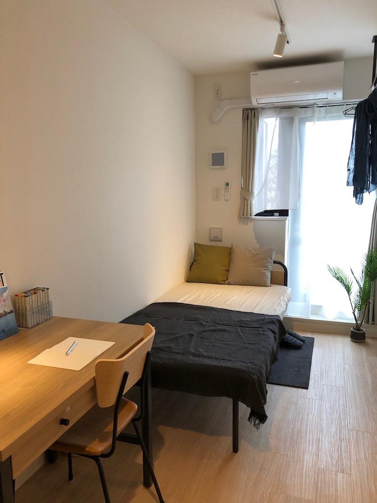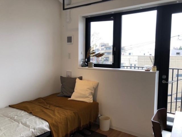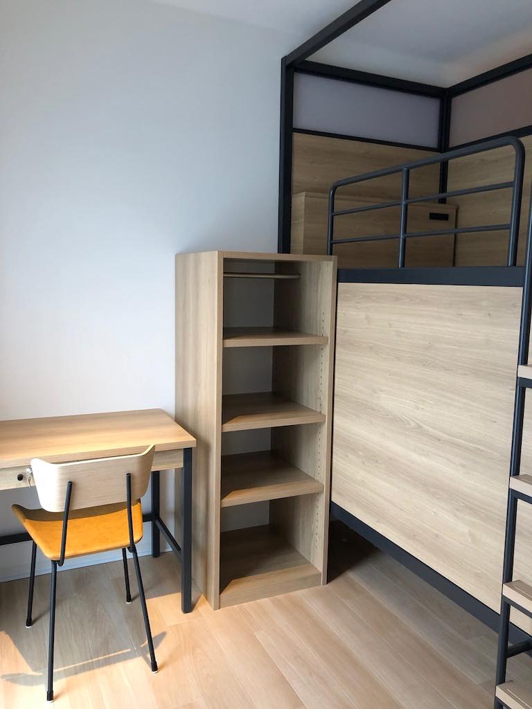 バストイレ付きの1人部屋がこちら。15㎡ほどのコンパクトな作りながらも窓が広く、圧迫感を全く感じさせません。机や椅子・ベッド・収納棚など備え付け家具が完備されているので必要最低限の荷物のみで入居可能です。