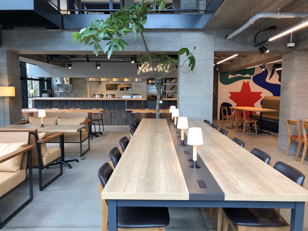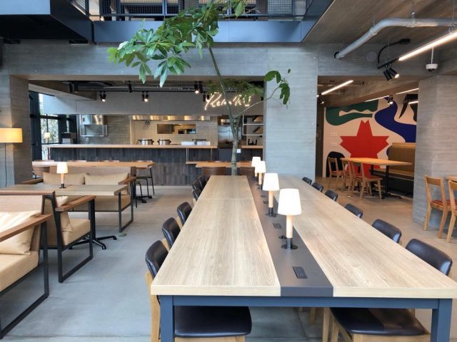 こちらの施設『意図せず人が集まる空間作り』を最も重視しており、食堂も自然と人が集まるよう綿密に設計されています。いつでもどこでもPCが開けるよう館内Wi-fi完備、食堂内各テーブルおよび床にもコンセントソケットが設置されており、どんな時でも食堂から居住者同士が気づいた時に話し合いができる空間に早変わり。