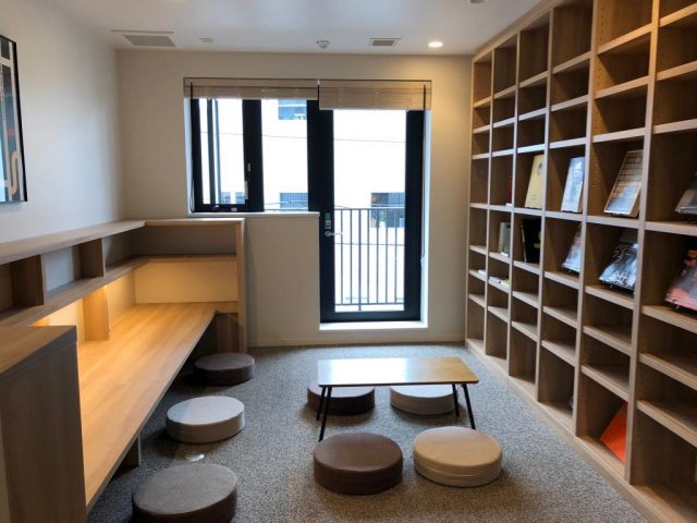 施設こだわりの一つであるという本棚が共有スペースに必ず設けられており、居住者同士が持ち寄った本を本棚に置いていき、自身で本棚を完成させていけくような空間を作って欲しいとの願いで設置されたようです。居住者同士の話のきっかけにもなりますし、自分だとなかなか読む機会のない分野の本に触れることで五感の刺激が育ちます。