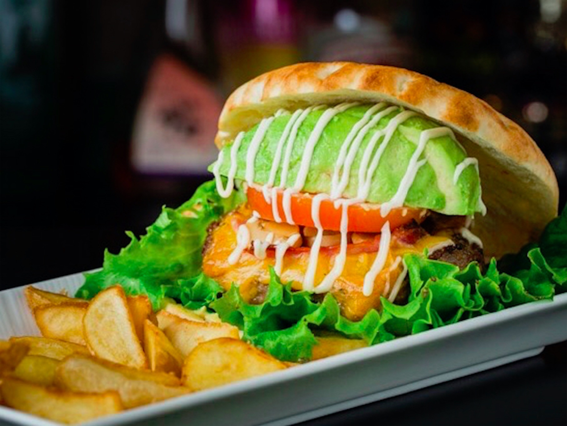 160gのパティにベーコン、トマト、アボカド、マッシュルーム、チェダーチーズ、グリーンカールをフォカッチャのバンズでボリューム満点の一品。