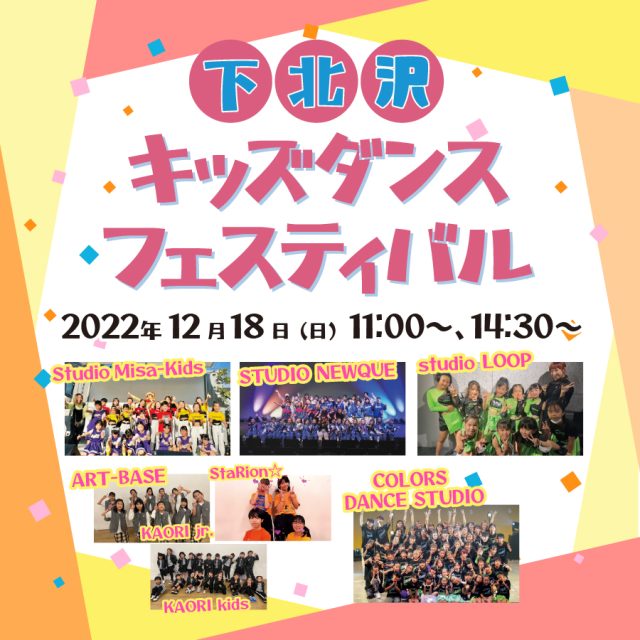 初開催する下北沢ダンスキッズフェスティバルは、世田谷区の5つのダンススタジオSTUDIO NEWQUE、studio LOOP、COLORS DANCE STUDIO、ART-BASE、Studio Misa-Kids のキッズチームが集まり、普段の練習の成果をこのダンスフェスティバルで爆発させます!
