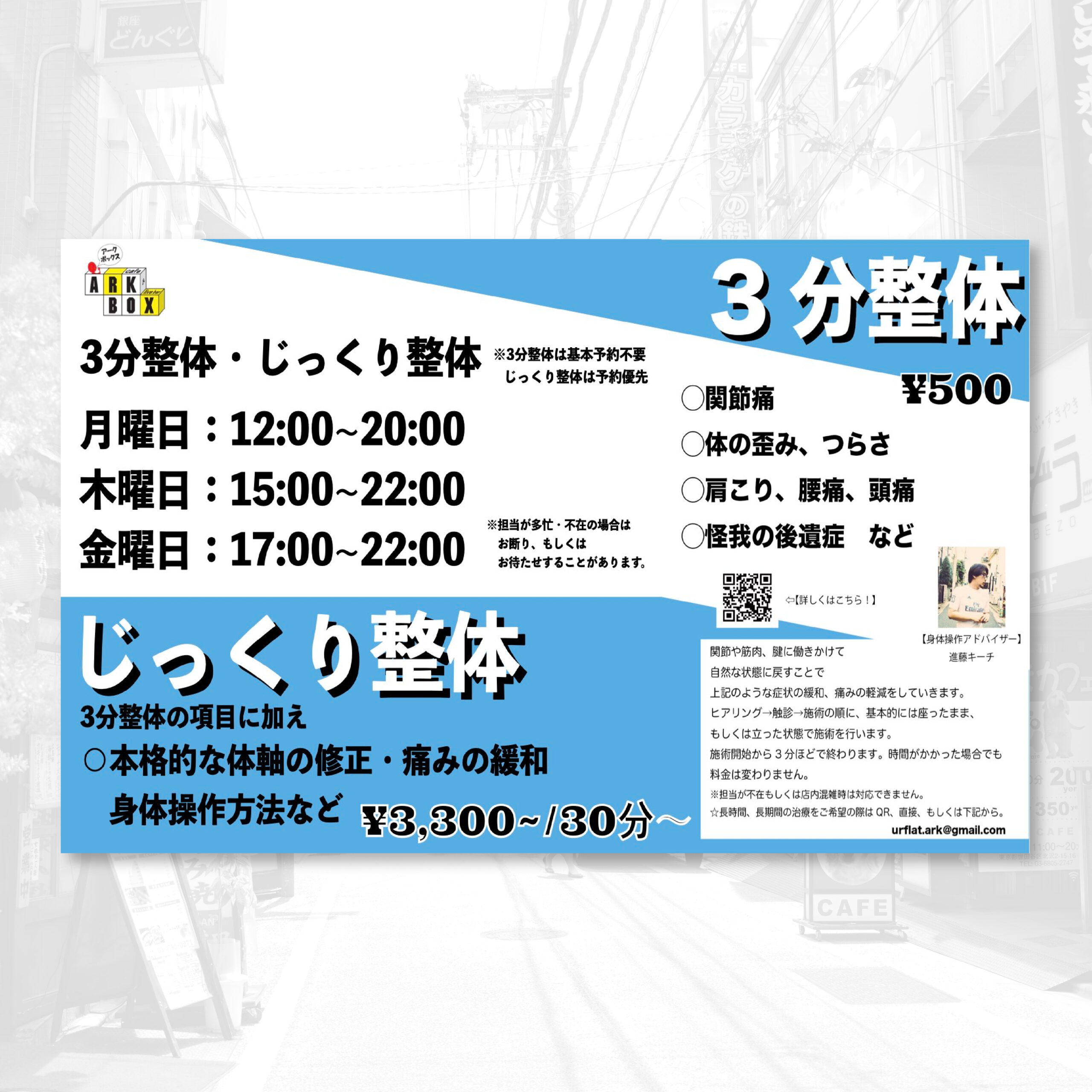 呑みながら整体!?カフェバーARK BOXで整体師さん常駐START 2023 7/04 特集&記事 2023年7月4日 料理の美味しい下北沢のカフェ&ライブバー「ARK BOX」で整体が受けられるようになりました!ご飲食をされる方は3分500円で整体が受けられちゃいます! 月曜日:12:00〜20:00木曜日:15:00〜22:00金曜日:17:00〜22:00 また、30分3,000円でじっくり整体も施術可能。(予約優先)お仕事帰りの隙間時間で体の歪みもリフレッシュしませんか?? 詳細・ご予約はこちら SHOP INFO 店名:ARK BOX住所:東京都世田谷区北沢3-25-1 MTビル3F電話番号:03-6804-9507営業時間:12:00~0:00L.O23:00定休日:火 Twitter リンク 特集&記事 この記事が気に入ったら フォローしてね! Follow @love_skz Follow Me よかったらシェアしてね! URLをコピーしました! 関連記事 骨を元の位置に戻そう!姿勢矯正にカチカチボディで挑むレポ【下北沢駅前の接骨院・はり灸院】 友達や家族と一緒もOK◎予約が取りやすく通いやすいパーソナルジム【ベホマパーソナルジム下北沢 Bスタジオ】 【連載】下北沢の女を目指す活動記録 初心者も上級者も◎自分のペースで多ジャンルの謎を楽しめる謎解きカフェで初挑戦!【謎解きカフェ繭玉】 カレーまんが、限定カレーとLIONビールのベストマッチを体験!【下北沢カレーフェスティバル2025】 【まとめ】下北沢のワーカーさんへおすすめのカレー屋10選 下北沢で働こう!街とつながるコワーキングスペース特集 【下北沢グルメ情報】臺クラフトビールが水曜日限定で「台湾ナイト」開催中!