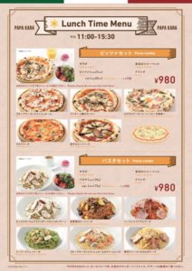 ディナータイムの500円Pizzaはなんと17種類!定番Pastaはもちろんのこと、いろいろな国の食材を使ったおいしい料理も多数ありますので、