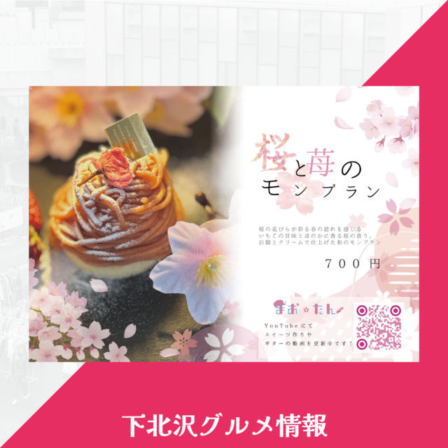 【下北沢グルメ情報】こがみからまおたんコラボ春スウィーツ登場! 2025 3/18 特集&記事 グルメ情報 2025年3月18日 下北沢駅東口徒歩3分。熊本出身オーナーがいるこがみから春にぴったりのコラボメニューが登場したので、ご紹介します! こがみ+まおたんコラボ春スウィーツ春のいちごと桜のモンブラン ¥700 桜の花びらが彩る春の訪れを感じるいちごの甘味とほのかに香る桜の香り。白餡とクリームで仕上げた和のモンブラン 春にぴったりの苺と桜のスイーツをぜひこがみでお楽しみください! SHOP INFO 店名:大衆居酒屋こがみ下北沢住所:世田谷区北沢2-9-2 辻ビル2F営業時間:18:00〜24:00定休日:不定休 Instagram Twitter リンク 店舗情報 大衆居酒屋こがみ下北沢 | I LOVE下北沢 お昼はカフェ、夜は居酒屋スタイルでリーズナブルな価格で営業中! 下北沢駅東口徒歩3分。 音楽や演劇の街、下北沢の老舗インディレーベルKOGA RECORDSが運営するKOGA MILK… 特集&記事 グルメ情報 この記事が気に入ったら フォローしてね! Follow @love_skz Follow Me よかったらシェアしてね! URLをコピーしました! 関連記事 7/14(火)|SHELTER 35th Anniversary KICK OFF GIG【下北沢SHELTER】 4/26(日)|第十五回シモキタ名人戦 GWは下北沢でスパイス料理とスイーツの無限ループ!50店舗が参加する「下北沢スパイス&スイーツ ~自由気ままに飲み歩き~」を4月23日から18日間にわたり開催 4/29(水)|NOISE MARKET【下北沢SHELTER】 骨を元の位置に戻そう!姿勢矯正にカチカチボディで挑むレポ【下北沢駅前の接骨院・はり灸院】 4/10(金)〜17(金)|映画『愛の挨拶』劇場公開【シモキタ – エキマエ – シネマ K2】 5/3(日)|響宴~グラス片手に楽しむクラシック~【Half Moon Hall】 友達や家族と一緒もOK◎予約が取りやすく通いやすいパーソナルジム【ベホマパーソナルジム下北沢 Bスタジオ】
