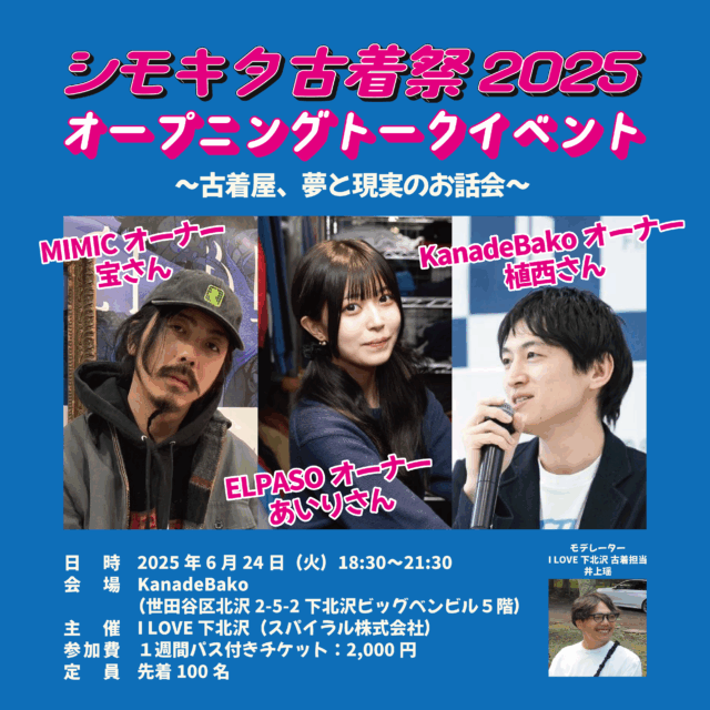 | タイトル | 「シモキタ古着祭2025」 オープニングトークイベント 〜古着屋、夢と現実のお話会〜 |