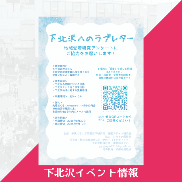 現在、千葉大学大学院園芸学研究科 庭園デザイン研究室の方々がシモキタ園藝部の協力で地域愛着研究アンケートを実施しています。