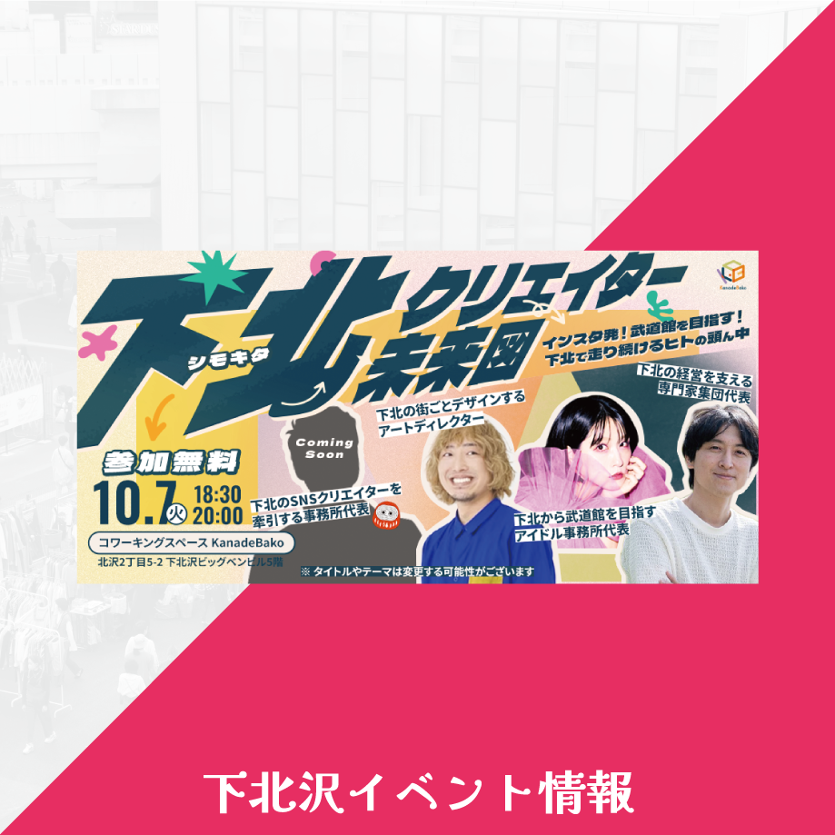 今回のトークイベントでは、下北沢を拠点に挑戦を続けるエンタメ・クリエイティブ系のプレイヤーを迎え、華々しいクリエイターの活躍の舞台裏、経営のリアルと未来像をクロストーク形式でお届けします。