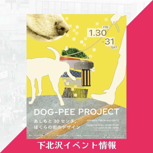 本展示では活動の中心地であった世田谷区・下北沢にて、犬のマーキング(DOG-PEE)を集める都市設置型プロダクトの試作から、リサーチ、社会実験とその成果を公開します。また、同時開催するワークショップとトークイベントにて望ましい街のこれからを、みなさんと共に模索します。